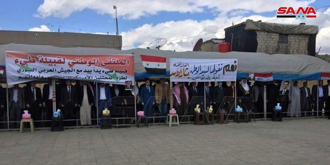 كما أكد الملتقى الذي عقد بحضور وجهاء وشيوخ عشائر من قبيلة طي دعم خيار المقاومة الشعبية لطرد كل وجود أجنبي غير شرعي يقوم بنهب الثروات وسرقة المحاصيل الزراعية بهدف التأثير على عزيمة الشعب السوري في مناطق الجزيرة، مشدداً على الوقوف خلف الجيش العربي السوري حتى تحرير كل شبر من تراب سورية.