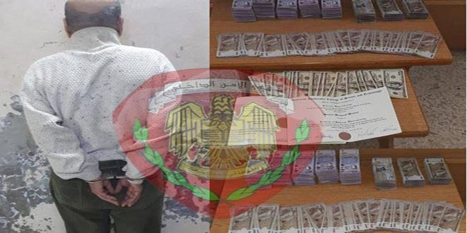 وذكرت وزارة الداخلية في بيان تلقت سانا نسخة منه أنه مع المتابعة والمراقبة تمكن فرع الأمن الجنائي في محافظة حماة من القبض على الشخص المذكور وعثر بمنزله في قرية دير شميل على 23 قطعة نقدية مزورة من فئة الدولار الأمريكي ومبلغ ثلاثة ملايين وتسعمئة وخمسة وثمانين ألف ليرة سورية مزورة جميعها من فئة الخمسة آلاف ليرة ومبلغ خمسة ملايين وثمانية وخمسين ألف ليرة سورية من فئة الألفي ليرة وشهادة جامعية باسمه صادرة عن الجامعة اللبنانية الأمريكية وهي مزورة.