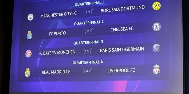 ووفق شبكة سكاي سبورتس فإن القرعة التي أقيمت اليوم في مدينة نيون السويسرية أسفرت عن مواجهة مكررة بين بايرن ميونيخ وباريس سان جيرمان في إعادة لنهائي العام الماضي وعن صدام ناري لريال مدريد أمام ليفربول فيما يلعب مانشستر سيتي أمام بوروسيا دورتموند ويلتقي تشيلسي نظيره بورتو.