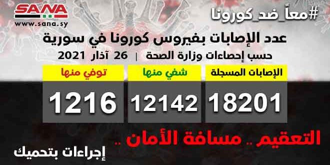 وأوضحت الوزارة في بيان تلقت سانا نسخة منه أن عدد الإصابات المسجلة في سورية بلغ حتى الان 18201 شفيت منها 12142 وتوفيت 1216 حالة.
