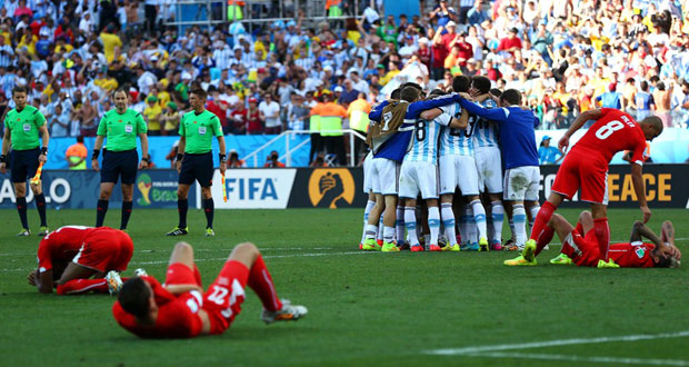 وانتهى الوقت الأصلي للمباراة بالتعادل السلبي ليلجأ المنتخبان للوقتين الاضافيين حيث تمكن منتخب الأرجنتين من تسجيل هدف الفوز في وقت قاتل عبر اللاعب انخيل دي ماريا في الدقيقة 118 مانحا منتخب بلاده بطاقة العبور للدور ربع النهائي.