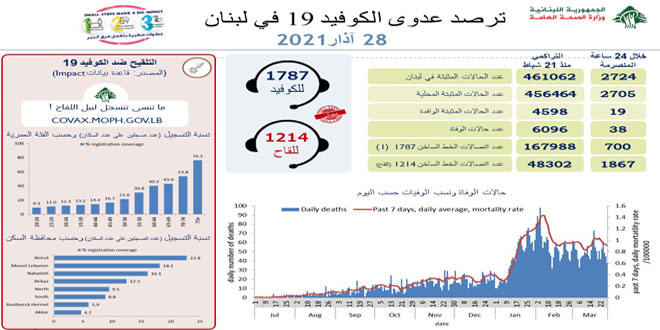 أعلنت وزارة الصحة اللبنانية تسجيل 38 حالة وفاة و2724 إصابة جديدة بفيروس كورونا خلال الساعات الأربع والعشرين الماضية.