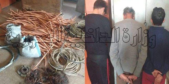 أعلنت وزارة الداخلية أن عناصر شرطة ناحية صحنايا بريف دمشق ألقوا القبض على شخصين أثناء قيامهما بسرقة الكابلات النحاسية من محولات كهربائية.