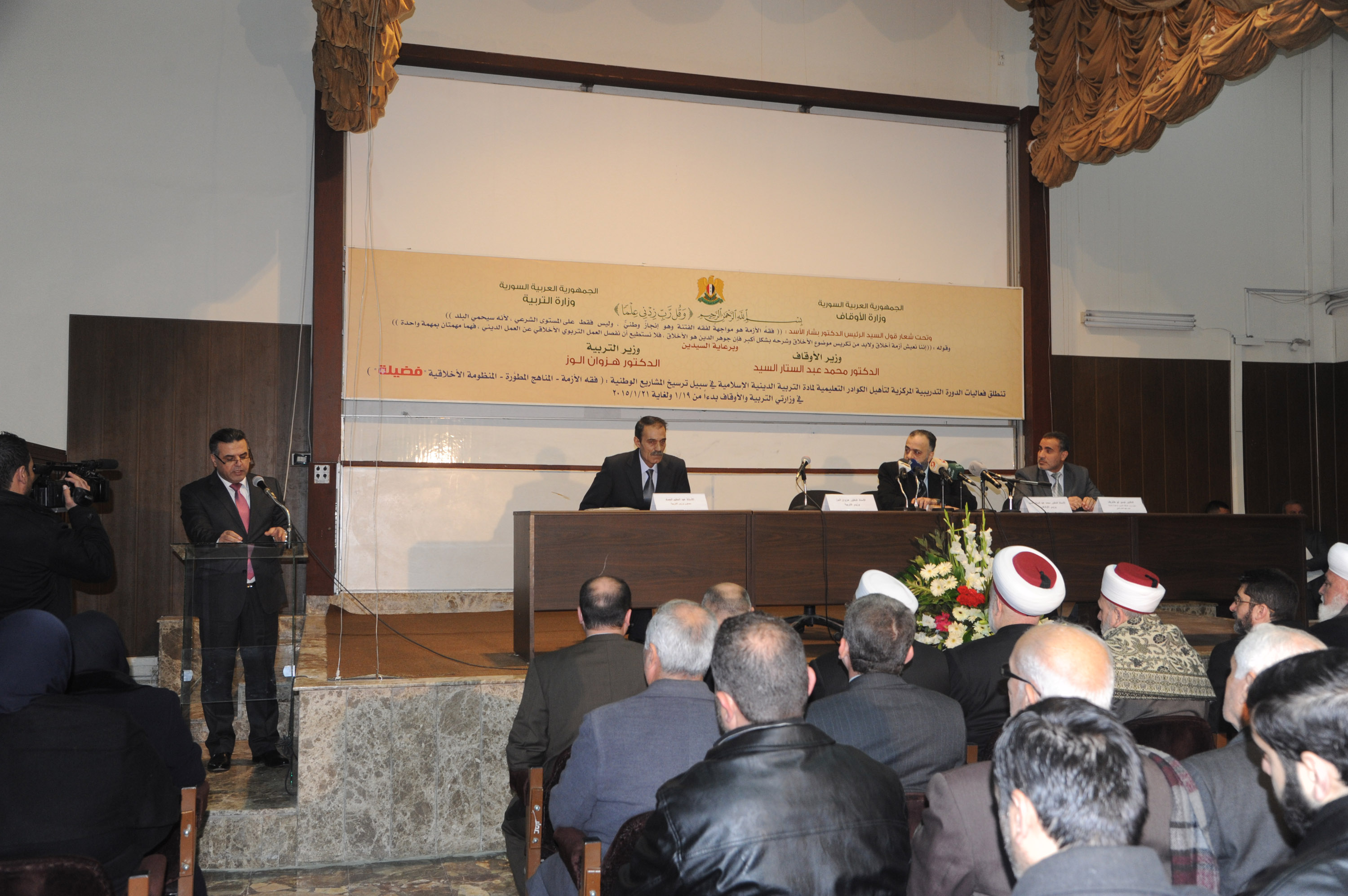 وأكد الدكتور هزوان الوز وزير التربية أن الوزارة وحرصا منها على تلقي تربية دينية واحدة في المرحلة الثانوية بمختلف فروعها، عمدت إلى تطوير مناهج التربية الدينية الإسلامية للصف الثالث الثانوي العام والمهني، في حين قامت وزارة الأوقاف بوضع المعايير الوطنية لمنظومة التعليم الشرعي وتطوير مناهجه للصفين الأول والثاني من المرحلة الإعدادية لهذا العام لتكون التربية الدينية في التعليم العام والمهني والشرعي تربية على الوطنية وحب الوطن والانتماء إليه وجوهرها الأخلاق .