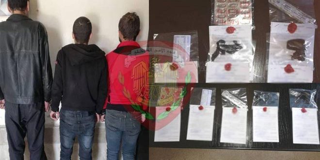 ألقى قسم شرطة الرمل الجنوبي في محافظة اللاذقية القبض على ثلاثة أشخاص من المطلوبين وأرباب السوابق بجرائم المخدرات وضبط بحوزتهم كميات من الحشيش المخدر وحبوب بيوغابلين وحبوب زولام المخدرة.