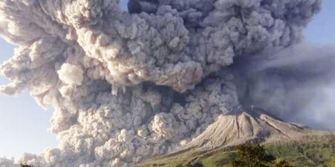 ثار بركان جبل سينابونغ في سومطرة الشمالية بإندونيسيا اليوم مطلقاً عموداً كثيفاً من الرماد لارتفاع يصل إلى ألف متر فوق قمته.