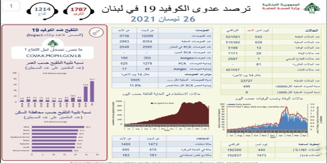 وأفادت الوزارة في بيان لها اليوم بأن العدد الإجمالي للإصابات بالفيروس في لبنان وصل إلى 521581 حالة بينما بلغ مجموع الوفيات 7171 حالة.