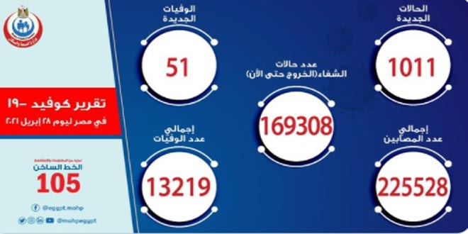أعلنت وزارة الصحة المصرية تسجيل 51 حالة وفاة و1011 إصابة جديدة بفيروس كورونا خلال الساعات الـ24 الماضية .