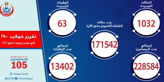 أعلنت وزارة الصحة والسكان المصرية اليوم تسجيل 63 حالة وفاة و1032 حالة إصابة جديدة بفيروس كورونا المستجد خلال الأربع وعشرين ساعة الماضية.