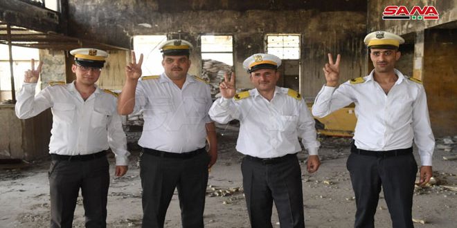 كاميرا سانا رافقت عدداً من عناصر حماية فرع المرور القديم الذي شكل حصنا منيعا لصد هجمات الإرهابيين الذين لم يستطيعوا دخوله حتى مع ارتكابهم جريمة تفجير جزء منه من خلال حفر نفق والوصول إليه.