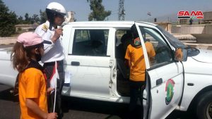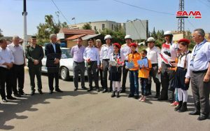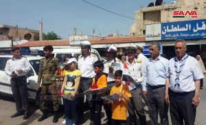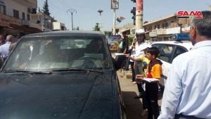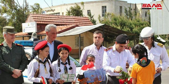 وقدم عدد من أطفال فرع منظمة طلائع البعث باقات الزهور للعناصر الشرطية كما تم توزيع بروشورات على السائقين وأصحاب المركبات تحذر من مخاطر السرعة الزائدة وتدعو إلى التقيد بأنظمة السير وقوانينه.