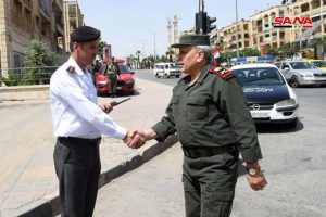 وزار اللواء عصام الشلي قائد شرطة المحافظة عدداً من النقاط المرورية في ساحة الجامعة والفرقان ودوار الشرطة وقدم التهاني لضباط وعناصر المرور كما زار فرع المرور بحلب واطلع على آلية العمل في أقسامه داعياً إلى حسن التعامل مع المواطنين والالتزام بتنفيذ تعليمات وضوابط قانون السير.