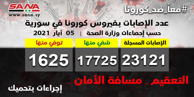 وأوضحت الوزارة في بيان تلقت سانا نسخة منه أن عدد الإصابات المسجلة في سورية بلغ حتى الآن 23121 شفيت منها 17725 وتوفيت 1625 حالة.