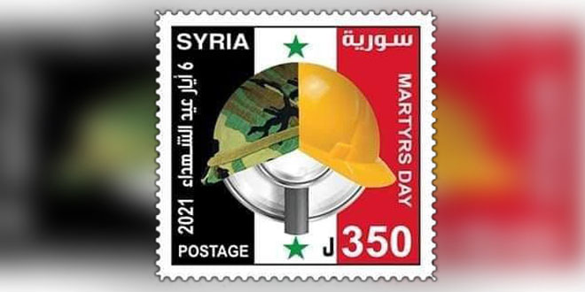أصدرت المؤسسة السورية للبريد طابعاً بريدياً تذكارياً بمناسبة عيد الشهداء الذي يصادف السادس من أيار من كل عام.
