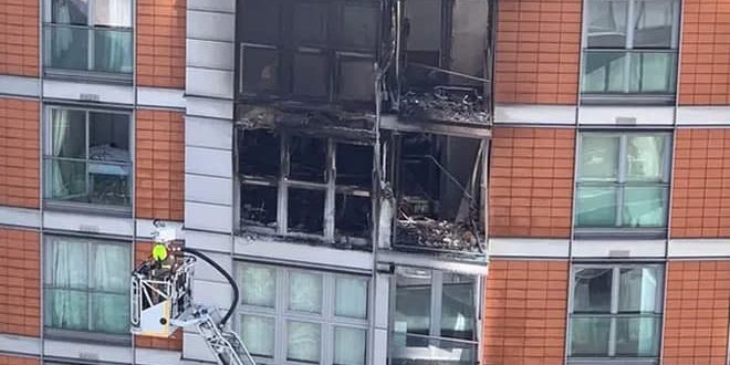ونقلت هيئة الإذاعة البريطانية عن إدارة إطفاء العاصمة قولها: إن “حريقاً كبيراً اندلع في الطوابق الثامن والتاسع والعاشر من البرج السكني ما أدى إلى إصابة شخصين تم نقلهما إلى المستشفى وهما يعانيان من آثار استنشاق الدخان”.