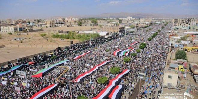 ففي العاصمة صنعاء شارك مئات الآلاف في مسيرة كبرى حاملين الأعلام اليمنية والفلسطينية ورددوا شعارات التأييد لفلسطين وقضيتها وشعبها الذي يواجه بطش كيان الاحتلال الإسرائيلي ويقاوم مخططاته التهويدية في القدس المحتلة.