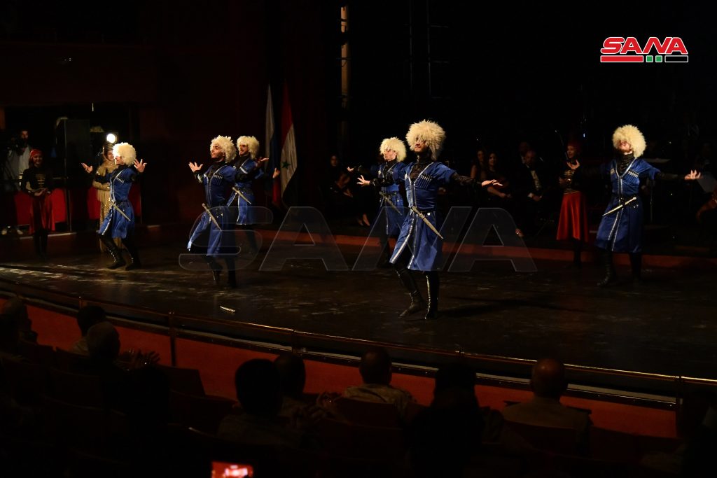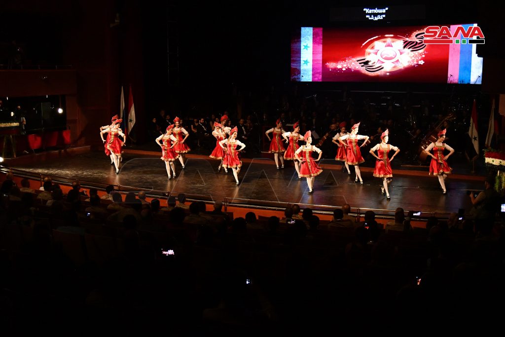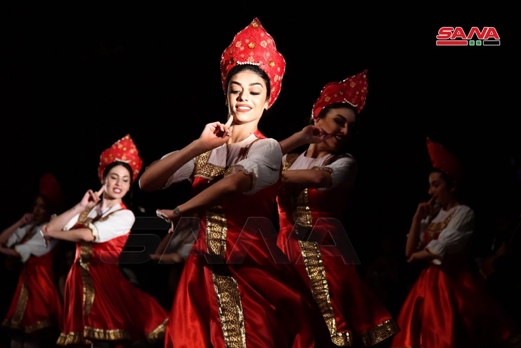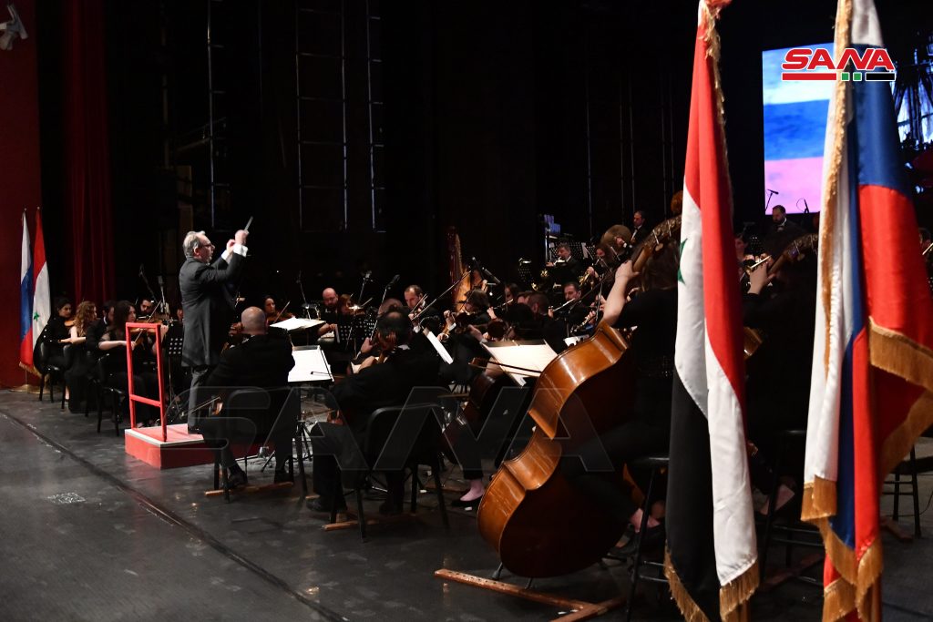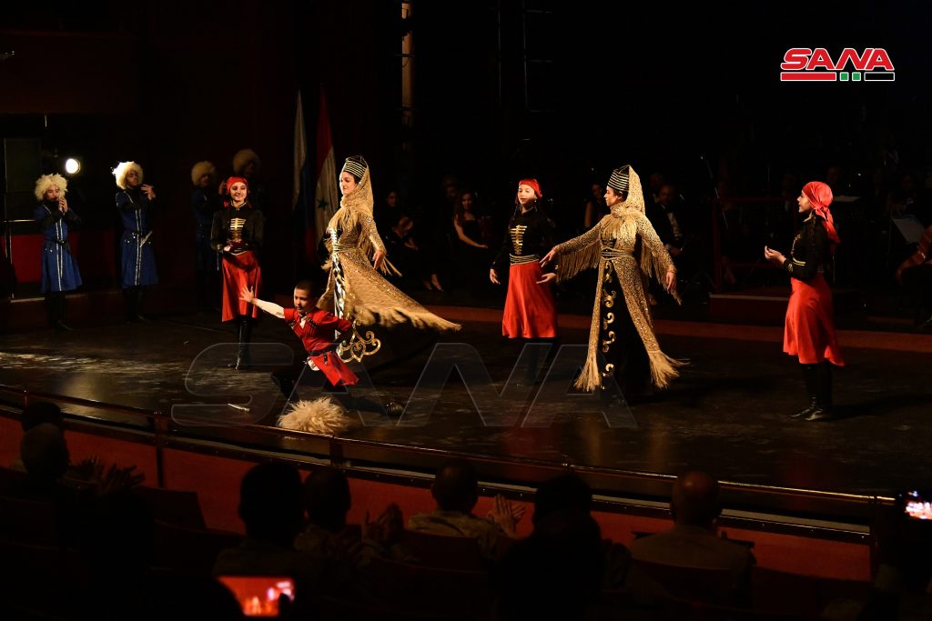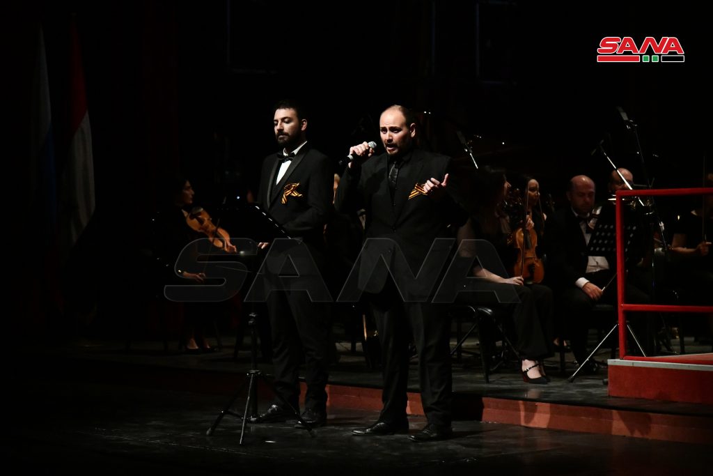 الحفل الذي قدمته مجموعة من الموسيقيين بقيادة المايسترو ميساك باغبودريان جاء على شكل رؤية بصرية تضمنت أغنيات أوبرالية وشعبية روسية عن الحرب وآلامها منها “ليل داكن” و”السمراء” و”لو لم يكن هناك حرب” و”المعركة الأخيرة” بأصوات مغنين من خريجي وطلاب المعهد العالي للموسيقا مع عرض مشاهد توثيقية عن تضحيات الجنود الروس إضافة إلى فقرات سورية وهي مقطوعة “تدمر بوابة الشمس” للمايسترو عدنان فتح الله وأغنية “راياتك بالعالي” يا سورية وعروض راقصة لطلاب قسم الرقص في المعهد العالي للفنون المسرحية ولفرقتي جلنار والجمعية الشركسية.