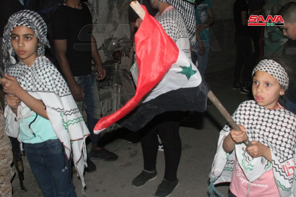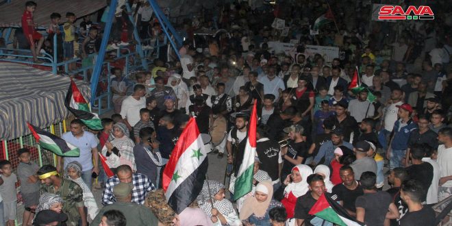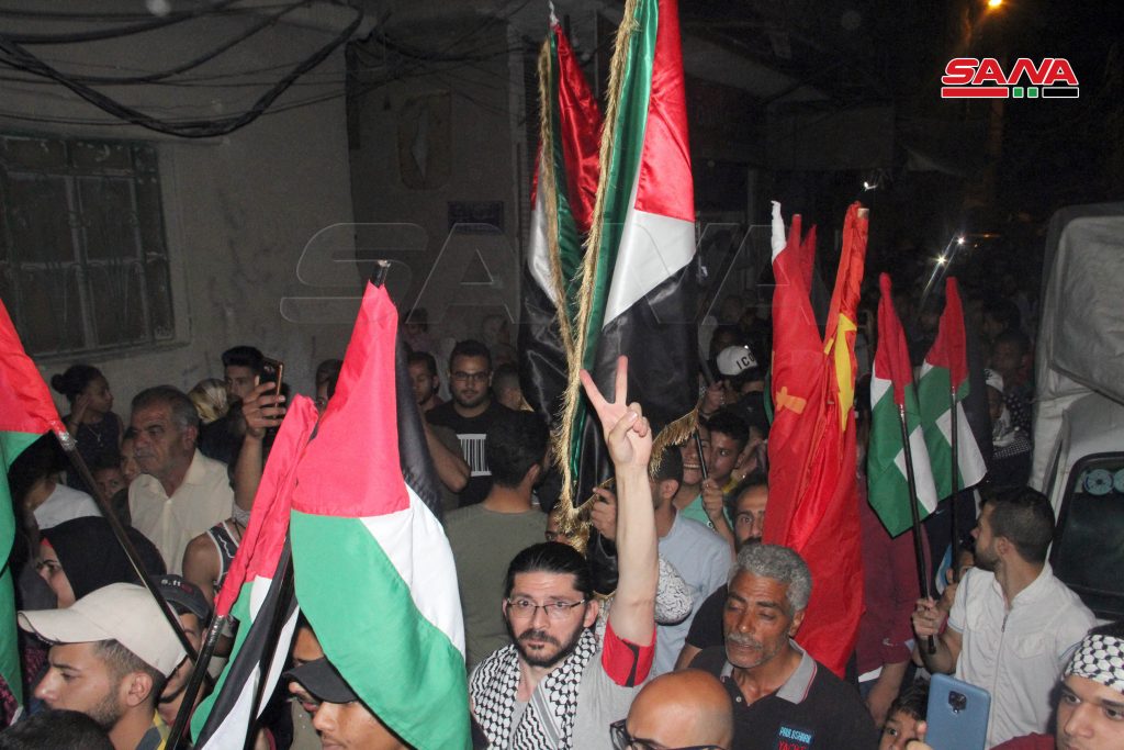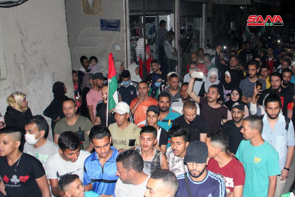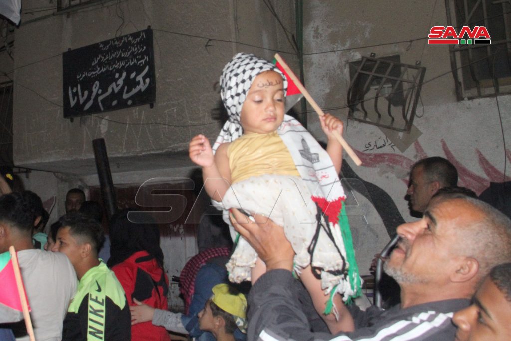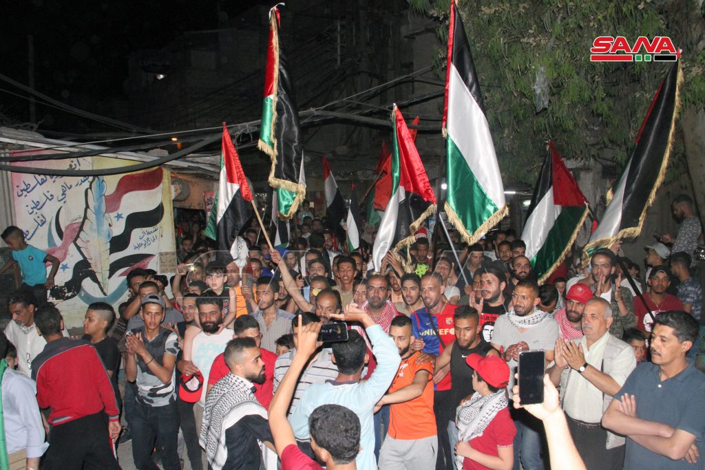 وحمل المشاركون في المسيرة التي جابت شوارع المخيم الأعلام الفلسطينية والسورية واللافتات المتضامنة مع أهالي القدس وغزة ورددوا هتافات داعمة لصمودهم ومستنكرة للعدوان الإسرائيلي الوحشي على الفلسطينيين.
