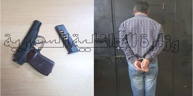 وذكرت وزارة الداخلية في بيان تلقت سانا نسخة منه اليوم أنه من خلال المتابعة والتحري تمكن فرع الأمن الجنائي في حماة من إلقاء القبض على أخطر المطلوبين بجرائم السلب والخطف وأثناء إلقاء القبض عليه حاول إشهار مسدس حربي على عناصر الدورية فتمت السيطرة عليه ومصادرة المسدس.