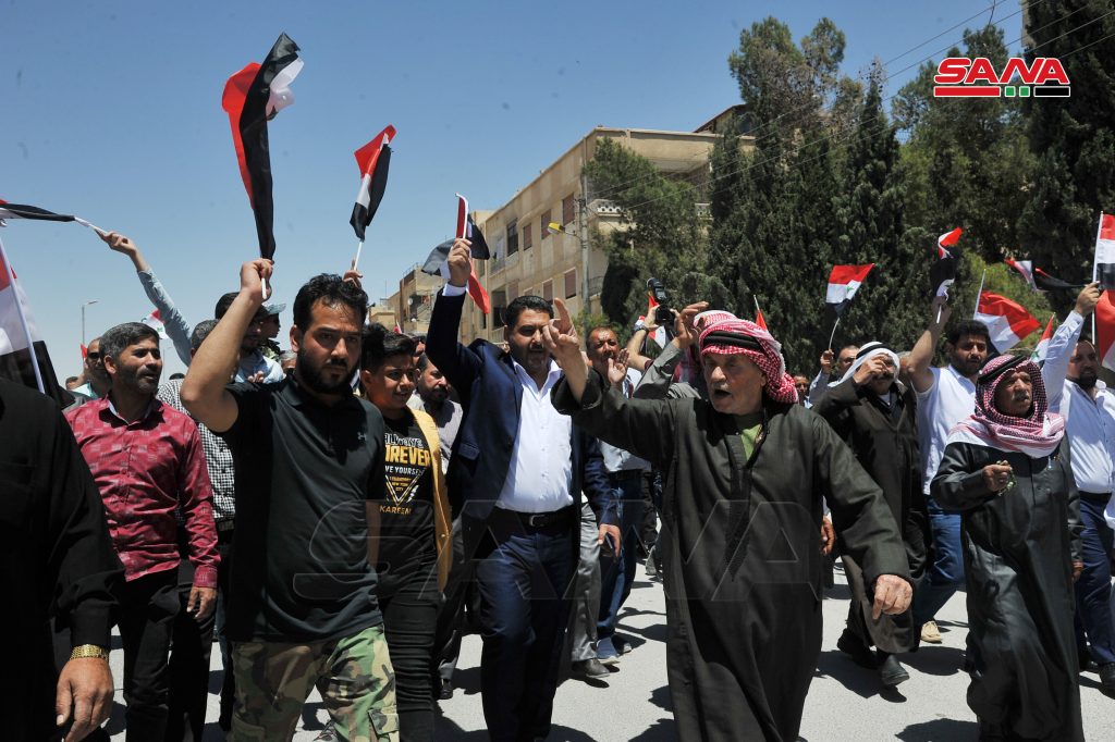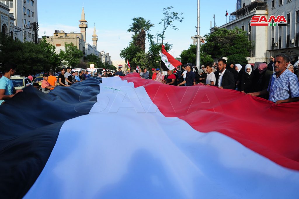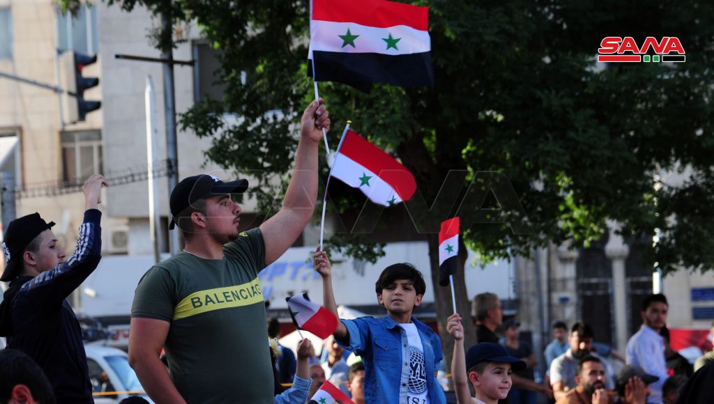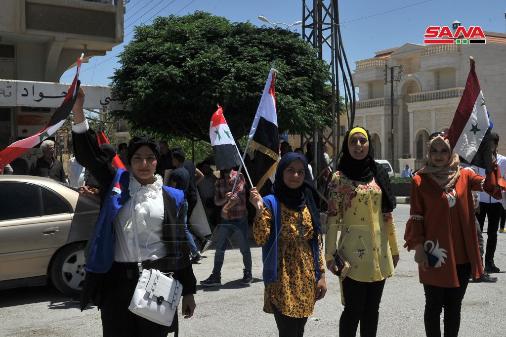 ورفع المشاركون أعلام سورية ولافتات تدعم المشاركة في الاستحقاق الرئاسي القادم وتضمنت الفعاليات أناشيد وطنية ومقاطع شعرية ومسير سيارات.