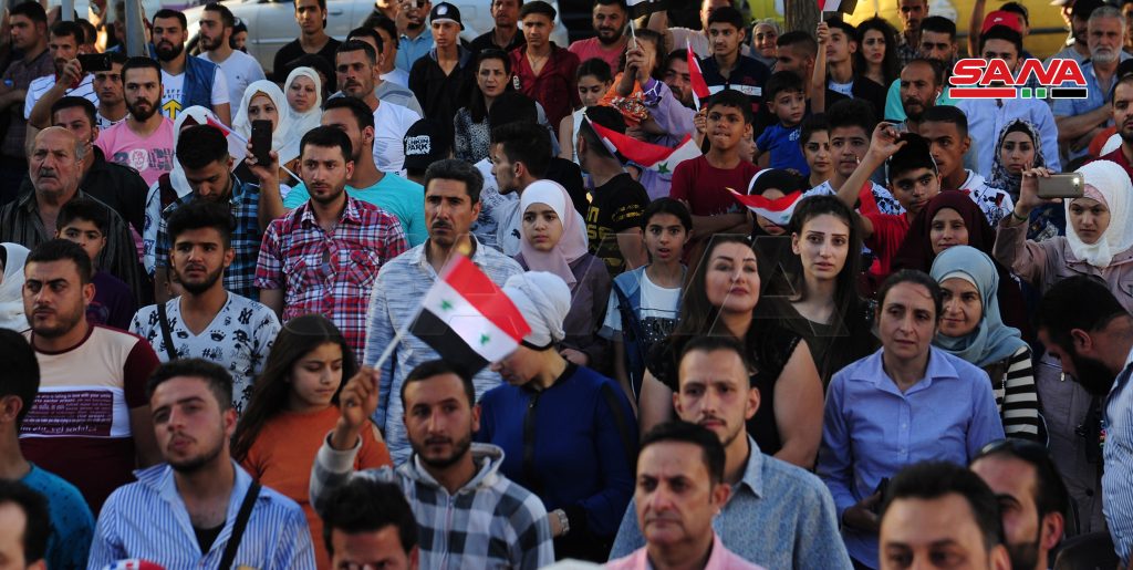 دعما للاستحقاق الدستوري شارك مئات المواطنين من مختلف مناطق دمشق وريفها بفعالية جماهيرية شعبية أقيمت مساء اليوم بساحة الحجاز في دمشق تضمنت أناشيد وطنية وهتافات باسم سورية وجيشها بمشاركة فرقة كشافة كنيسة “سيدة دمشق”.