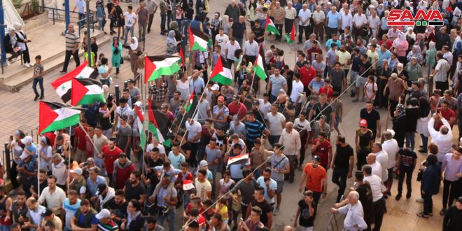 نظمت الفصائل الوطنية الفلسطينية في مخيم العائدين في اللاذقية اليوم مسيرة جماهيرية نصرة وتضامناً مع الشعب الفلسطيني وتنديداً بالعدوان الإسرائيلي الذي يتعرض له.