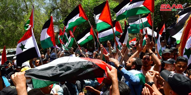 وحمل المشاركون في الوقفة التي نظمتها فصائل المقاومة الفلسطينية أمام مقر الأمم المتحدة بدمشق الأعلام الوطنية السورية والفلسطينية واللافتات التي تؤكد دعم الشعب الفلسطيني والتضامن معه في ظل ما يتعرض له من اعتداءات وممارسات وحشية من قبل سلطات الاحتلال.