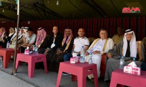 وخلال التجمع الذي ضم شيوخ العشائر والقبائل العربية من الرقة ودير الزور والقنيطرة والسويداء وفعاليات شعبية وأهلية من المحافظة بين الشيخ سليمان الشواخ شيخ عشائر الرقة أن المشاركة الفاعلة بالانتخابات الرئاسية واجب وطني على كل سوري شريف لاختيار المرشح القادر على قيادة سورية إلى بر الأمان والحفاظ على وحدة أراضيها والوقوف في وجه كل معتد يريد احتلال الأرض ونهب الثروات الوطنية.