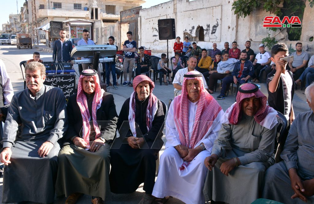 وفي قرية أم العمد أقامت الفعاليات الأهلية والشعبية مهرجاناً وطنياً تضمن عروضاً فنية قدمها أطفال وشباب القرية بالزي العسكري.