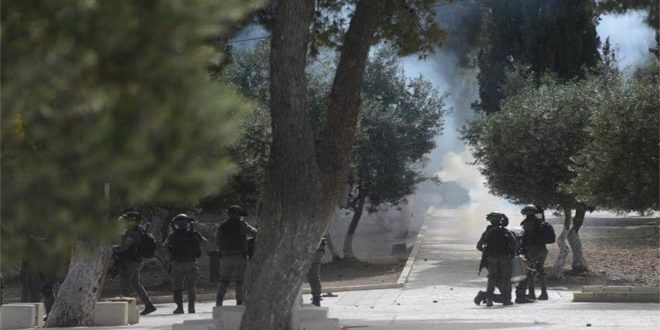 أصيب عدد من الفلسطينيين اليوم خلال اقتحام قوات الاحتلال الإسرائيلي باحات المسجد الأقصى.