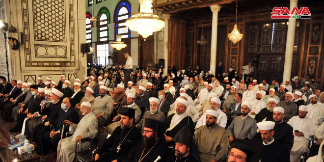 وألقي خلال الفعالية كلمات وزير الأوقاف الدكتور محمد عبد الستار السيد والوكيل البطريركي لبطريركية انطاكية وسائر المشرق للروم الأرثوذكس المطران “أفرام معلولي” والنائب البطريركي لشؤون الشباب والتنشئة المسيحية في الكنيسة السريانية الأرثوذكسية مار انتيموس جاك يعقوب ومطران أبرشية دمشق وتوابعها للأرمن الأرثوذكس آرماش نالبنديان ورئيس السينودوس الإنجيلي في سورية ولبنان القس بطرس زاعور وممثل بطريرك انطاكية وسائر المشرق للروم الملكيين الكاثوليك الأب فادي حمصي ورئيس الدائرة الدينية للرئاسة الروحية للمسلمين الموحدين الشيخ ياسر أبو فخر وفضيلة.