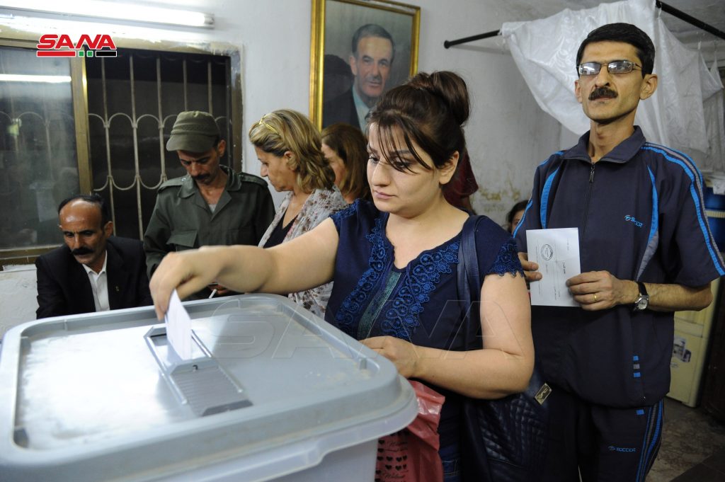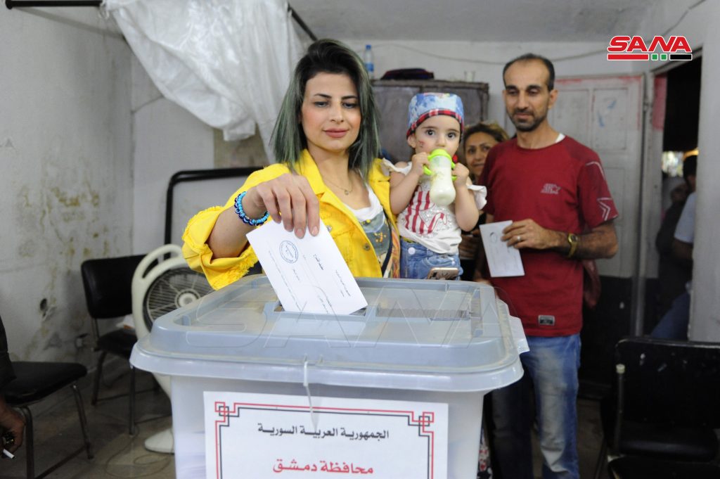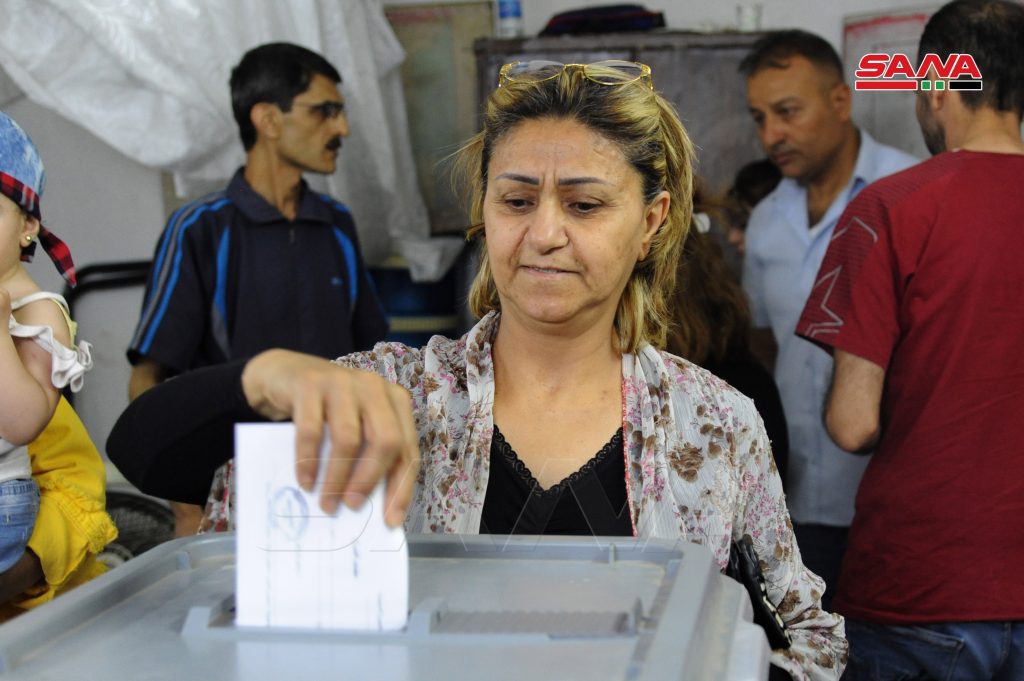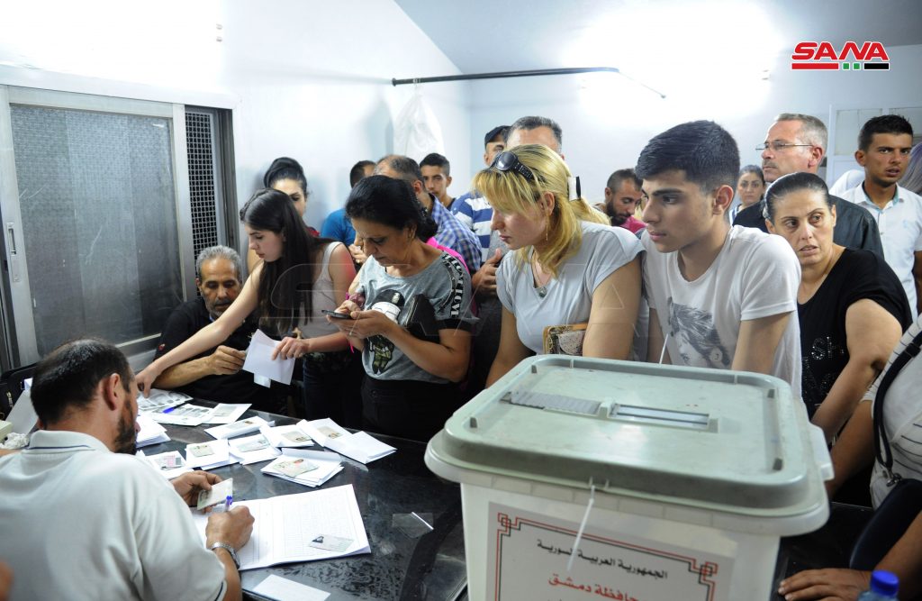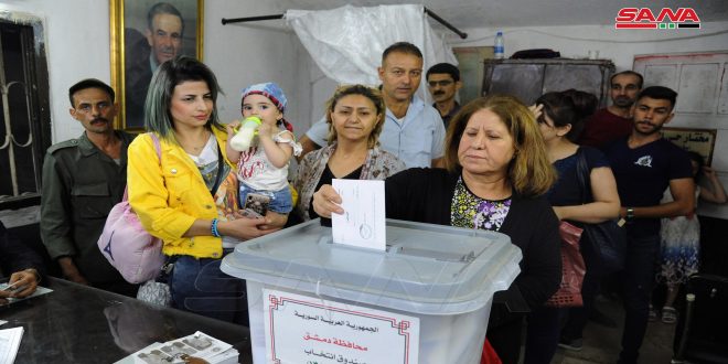 لاتزال مراكز دمشق الانتخابية تشهد خلال ساعات المساء توافدا للناخبين بعد تمديد فترة الانتخابات خمس ساعات إضافية في العديد من مراكز الاقتراع ومنها مراكز جبل الرز وحي الورود بدمشق وسط أجواء من الفرح يصنعها الناخبون بهتافاتهم وأغانيهم الوطنية.