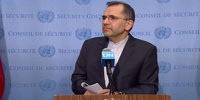 وخلال جلسة لمجلس الأمن الدولي عقدت أمس عبر الفيديو أوضح مندوب إيران الدائم لدى الأمم المتحدة مجيد تخت روانجي أن الإجراءات القسرية أحادية الجانب المفروضة على الشعب السوري “غير مسؤولة وغير أخلاقية” وقال “ندين استخدام الأغذية والأدوية سلاحاً وينبغي على مجلس الأمن التركيز على إجراءات يمكنها خفض معاناة الشعب السوري سريعاً والإسراع بعودة المهجرين إلى أماكن إقامتهم”.
