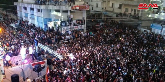 بدورها أكدت مها إبراهيم عضو مجلس محافظة عن منطقة القدموس أن المشاركة الواسعة التي شهدتها الانتخابات الرئاسية والمشاركة الكبيرة بهذه التجمعات الجماهيرية هي رسالة لكل العالم بأن السوريين يد واحدة اختاروا قائدهم ويقفون خلف قيادته.