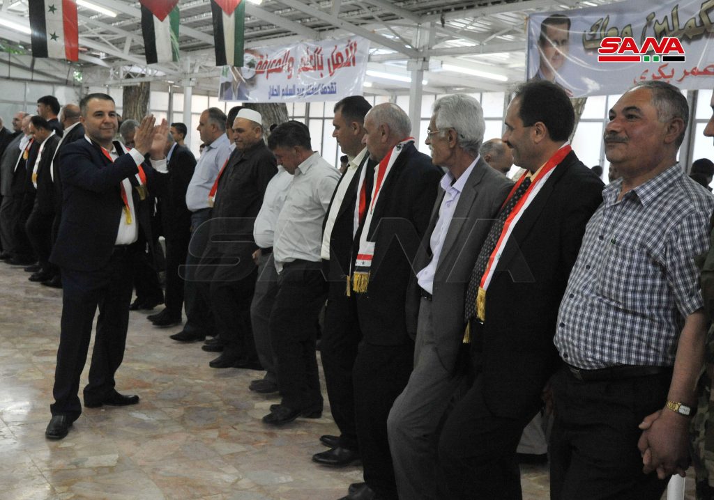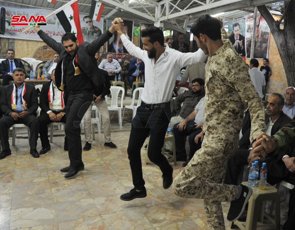 وتخلل التجمع الذي ضم أيضاً عدداً من الفعاليات الأهلية والاقتصادية في محافظة ريف دمشق ترديد أغانِ شعبية ووطنية وهتافات عن الوطن والجيش العربي السوري.