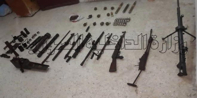وذكرت وزارة الداخلية على موقعها الإلكتروني أن فرع الأمن الجنائي في حمص عثر على أسلحة ضمن أراض زراعية كانت تستخدمها المجموعات الإرهابية كمقر للتدريب ومن بينها رشاش نوع “هوشكس” وبندقية حربية ومذخر و3 قذائف هجومية مع صواعقها و23 قنبلة متنوعة الأشكال والأنواع ومكونات متفرقة لأسلحة متنوعة.