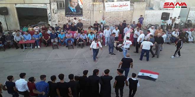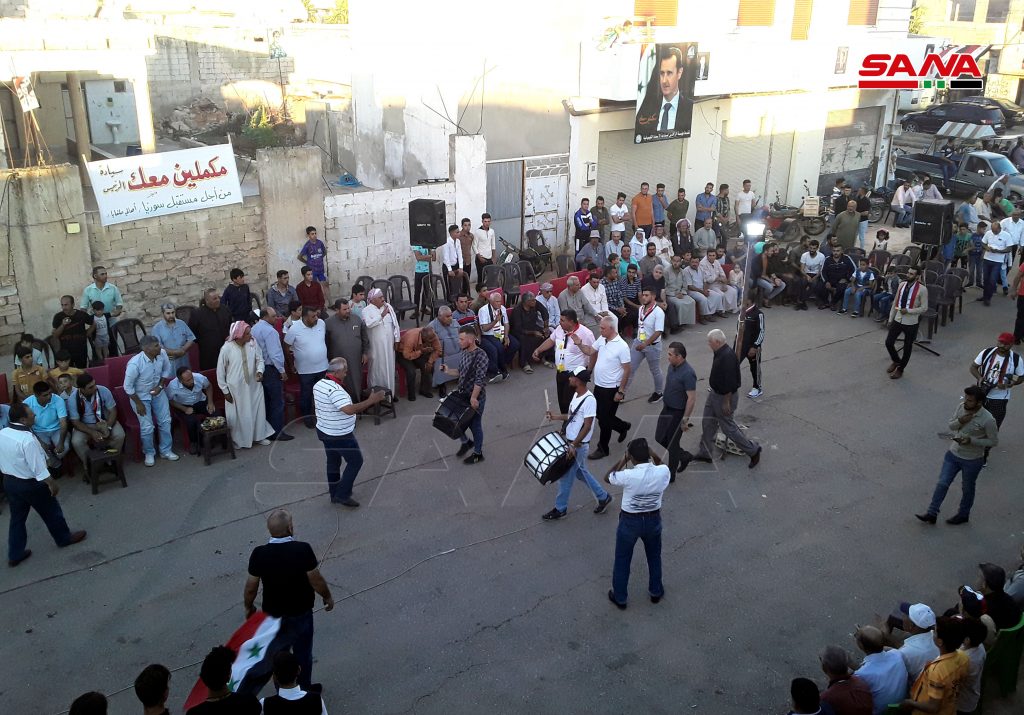 ورفع المشاركون في التجمع الأعلام الوطنية وصور الرئيس الأسد ورددوا هتافات وأغاني وطنية معربين عن فرحتهم الكبيرة بهذا الفوز وثقتهم بقيادة الرئيس الأسد ومؤكدين أن المرحلة القادمة ستكون مرحلة إعادة إعمار ما دمره الإرهاب.