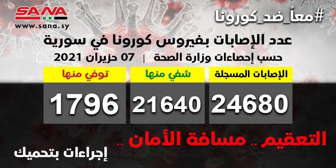 وأوضحت الوزارة في بيان تلقت سانا نسخة منه أن عدد الإصابات المسجلة في سورية بلغ حتى الأن 24680 شفيت منها 21640 وتوفيت 1796 حالة.