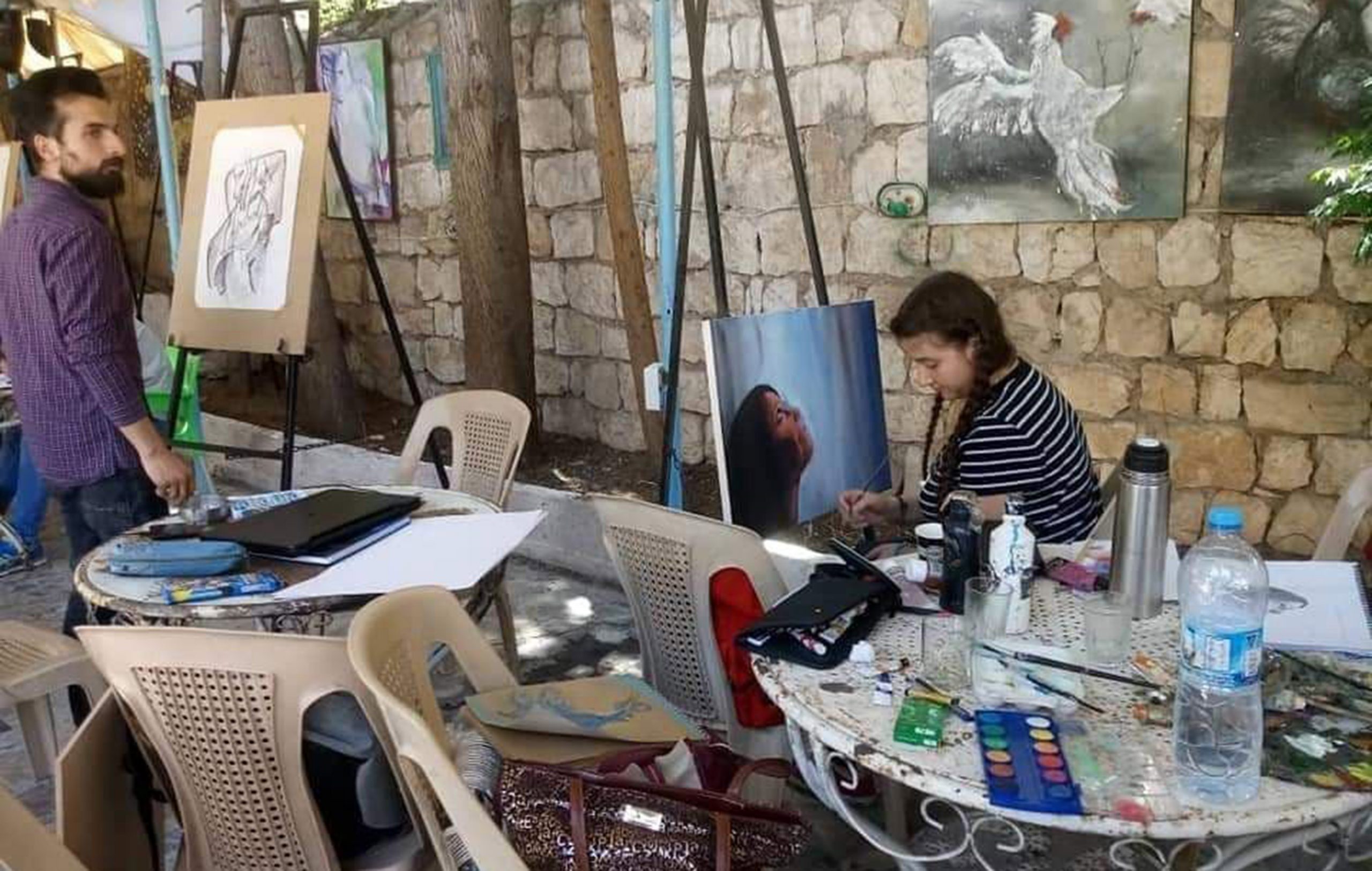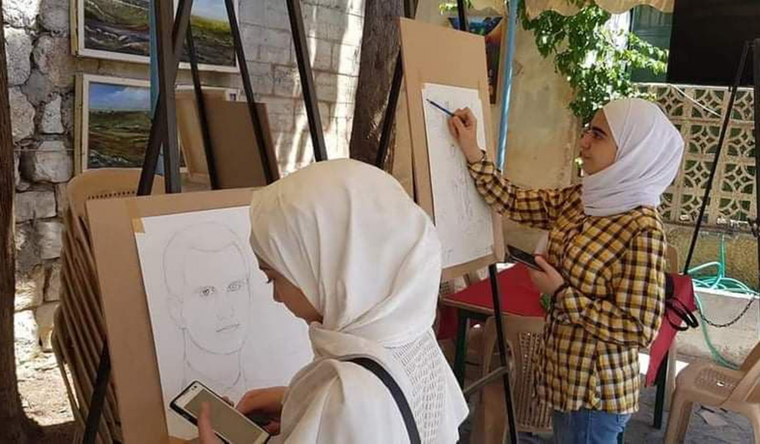 المشارك رماح أبو زيدان رسم لوحة بتقنية خاصة اعتمد فيها الطباعة والكولاج وترمز للأثر الذي يتركه الإنسان في الحياة أما المشاركة سهى عيد فنفذت لوحة بتقنية الألوان الزيتية عبرت من خلالها عن التآخي بين مكونات الشعب السوري.