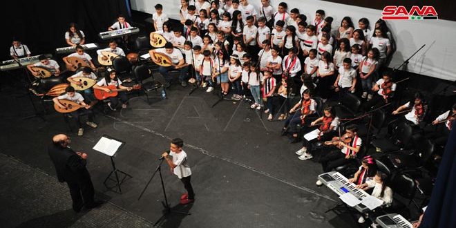100 طفل يغنون على مسرح مجمع دمر احتفالاً بانتخاب الدكتور بشار الأسد رئيساً للجمهورية
