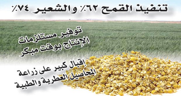 و نوه وزير الزراعة إلى تجاوب الأخوة الفلاحين مع خطط الوزارة في تنفيذ زراعة المحاصيل العطرية والطبية الشتوية لافتا الى ان المساحات المزروعة في الحسكة بلغت 57,3 ألف هكتار في حين المخطط 7,7 الاف هكتار اما المساحة الكلية في المحافظات فقد بلغ 78 الف هكتار والزراعة ما زالت مستمرة منوها ان التوسع بالمساحات المزروعة لم يأت على حساب محصول القمح.