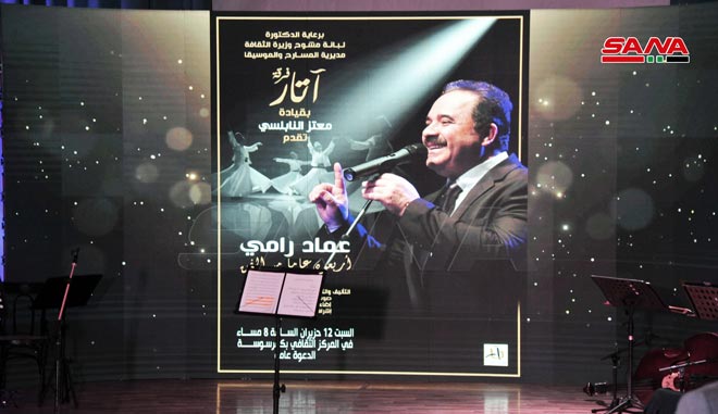 رافقت فرقة آتار الموسيقية بقيادة المايسترو معتز النابلسي عندليب الإنشاد الديني عماد رامي برحلة إلى زمن الفن الجميل في حفلة استضافها المركز الثقافي العربي في كفر سوسة بدمشق وسط حضور لافت.