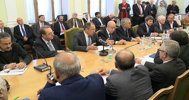 وخاطب لافروف الوفدين بالقول “إن السمعة التي تملكونها في روسيا هي أنكم المحبون الحقيقيون لوطنكم فأنتم قد وضعتم مصالح سورية فوق اعتباراتكم الشخصية والمكاسب الذاتية واجتمعتم اليوم للبحث عن سبل استعادة السلام إلى وطنكم”.