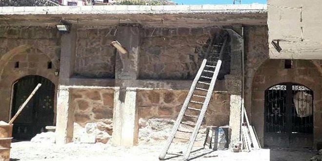 وأشار إلى أن الخان الأول وهو الأقدم بني عام 1221 ميلادي بالزاوية الجنوبية الغربية من بركة الماء على بعد نحو50 متراً منها وكانت مساحته الإجمالية أكثر من 3 آلاف متر مربع ومنطقة الحمامات كانت تقع إلى الشرق منها بأمتار معدودة لافتا إلى أن الحفريات التي تمت بساحة الشهداء أثناء تعبيدها دلت على أن هذه الحمامات ترتبط بأقنية مغطاة تؤمن الماء من البركة المجاورة حيث لا يزال أحد أجران هذا الحمام قرب لوحة الخان التي تزدان بها واجهة إحدى الغرف والتي جاء فيها بأن من أمر بعمارة هذا الخان هو عز الدين أيبك سنة 621 هجرية.