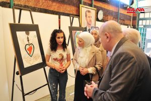 ومن مشروع بكرة إلنا عبرت آية شدود من الصف التاسع عن حبها للدكتور بشار الأسد من خلال رسمها صورة له مع حمامة السلام معبرة عن سعادتها بالمشاركة في هذا المعرض.