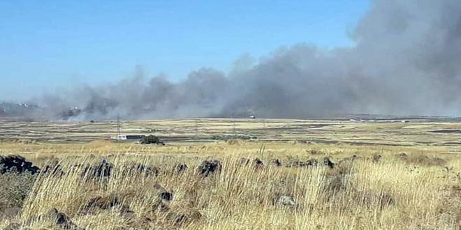 أخمد فوج إطفاء درعا ودائرة الحراج في مديرية الزراعة بالتعاون مع الأهالي وفوج إطفاء القنيطرة ومديرية الزراعة فيها مساء اليوم حريقاً نشب في حقول قمح بين محافظتي درعا والقنيطرة.