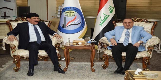 بحث وزير العدل العراقي القاضي سالار عبد الستار محمد مع سفير سورية في بغداد سطام جدعان الدندح آفاق التعاون والتنسيق المشترك بين البلدين الشقيقين في المجالات القانونية والقضائية.