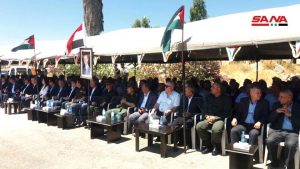 وتوجه المحافظ بالتحية إلى أهلنا الصامدين في قرى مجدل شمس وعين قنية وبقعاثا ومسعدة في الجولان المحتل الذين يتصدون لسياسات وإجراءات سلطات الاحتلال الهادفة إلى تهويد الجولان السوري المحتل وضمه إلى كيانه المصطنع.