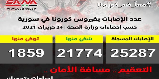 وأوضحت الوزارة في بيان تلقت سانا نسخة منه أن عدد الإصابات المسجلة في سورية بلغ حتى الآن 25287 شفيت 21774 وتوفيت 1859 حالة.