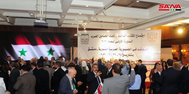 أكد المشاركون باجتماع المكتب الدائم لاتحاد المحامين العرب بدورته الأولى لعام 2021 المنعقد حالياً بدمشق على أهمية دور سورية العروبي وضرورة دعمها في حربها على الإرهاب لتحقيق النصر الكامل والمطالبة برفع الإجراءات الاقتصادية القسرية الأحادية الجانب المفروضة على الشعب السوري المقاوم ومواصلة دعم القضية الفلسطينية وحق العودة للفلسطينيين ودعم المقاومة التي تعد سورية محورها.